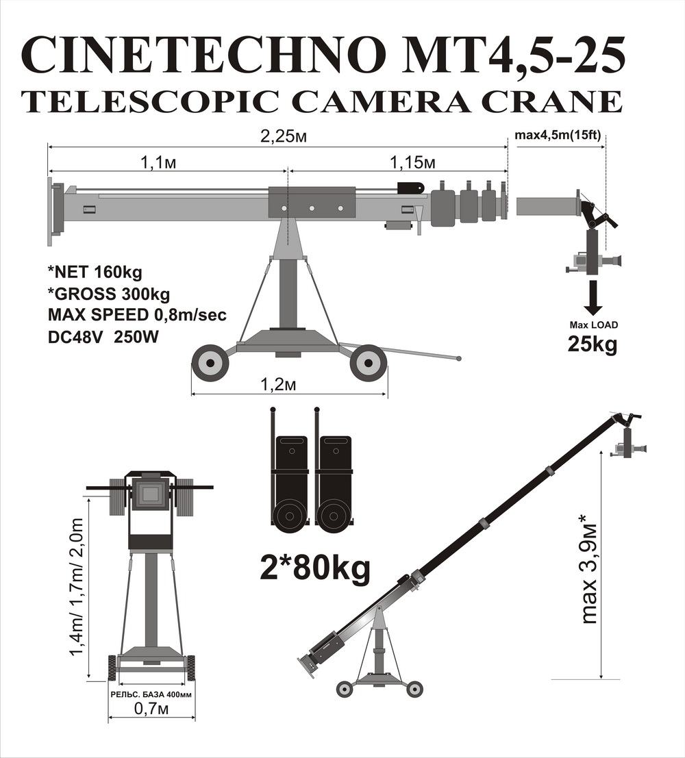 Телескопические операторские краны предназначены для расширения изобразительных возможностей за счет свободного перемещения съемочной камеры в пространстве по трем координатам. Это позволяет создать динамическую перспективу недостижимую никакими другими средствами, а также, получить необычные при классических методах съемок ракурсы. При съемках постановочных планов (кино и телевизионные картины, клипы, реклама) использование операторского крана позволяет значительно снизить производственные расходы в съемочном периоде за счет возможности съемки более длинными планами (при разработке глубокой мизансцены), а также за счет возможности быстрой перестройки камеры на последующие планы.